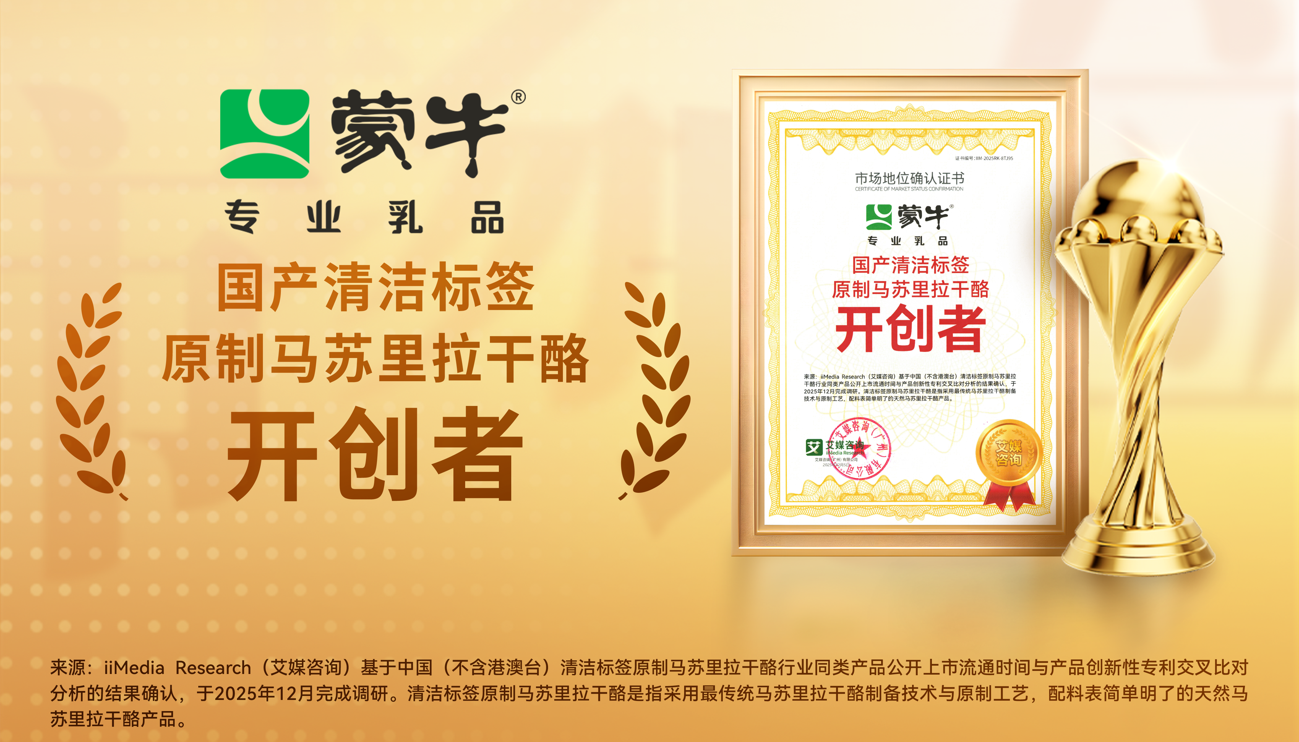 基于大数据系统监测及严格的调查,以及对中国(不含港澳台)清洁标签马苏里拉奶酪市场研究比对的结果进行统计确认,全球领先的新经济产业第三方数据挖掘和分析机构iiMedia Research(艾媒咨询)授予蒙牛马苏里拉干酪“国产清洁标签原制马苏里拉干酪开创者”市场地位确认证书。