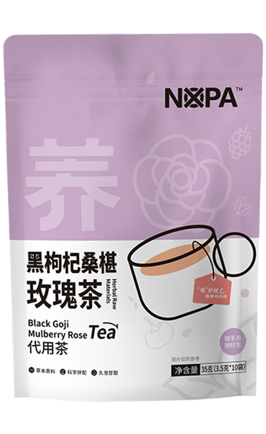 NOPA黑枸杞桑椹玫瑰茶,臻选优质桑椹、重瓣红玫瑰、大枣、黑果枸杞,草本原料,科学拼配,健康源于自然本味,醇香晚A茶,满满花青素,跟颜值焦虑说拜拜;看得见的真材实料,拒绝添加剂,0糖0香精0色素,天然食补,还原本真好味道;好茶经久耐泡,采用可降解内袋,营养成分更易析出,汤色紫红透亮清香怡人,口感清爽,可反复冲泡。